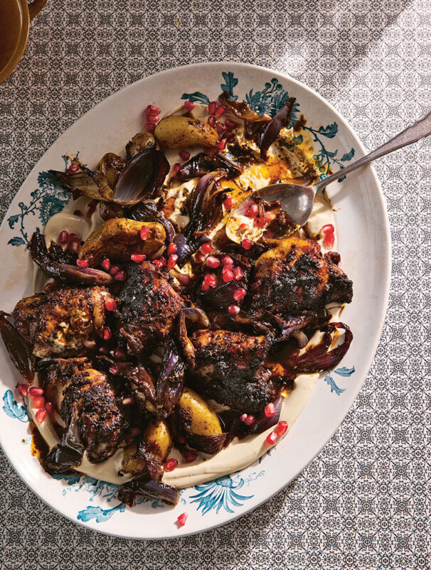 To call this a traybake does this recipe a disservice – and yet a traybake is precisely what it is. Golden, crispy chicken skin and sticky pomegranate onions meld with sweet heat from the ancho chilli and lovely aromatics from the spices. The creamy tahini gives the plate a savoury note. Bliss. The juices are to die for.