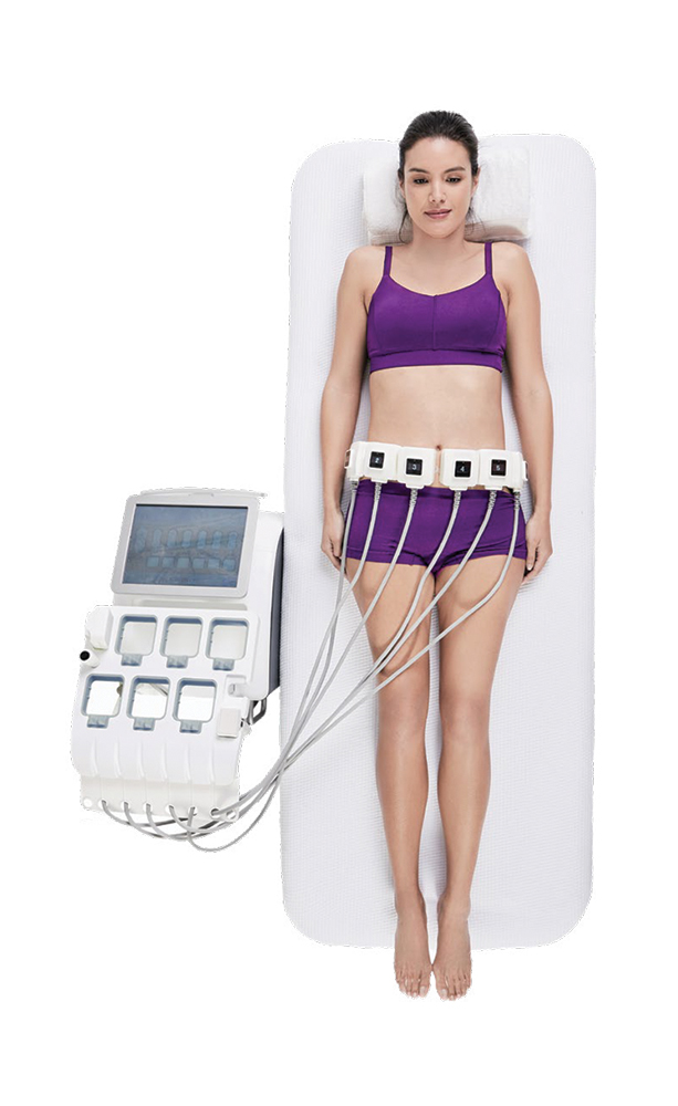 The initial consultation is performed to assess and discuss your concerns and desired aesthetic goals, then a tailored and customised treatment plan will be created. A total of six handpieces can be used per 15-minute treatment, and multiple areas can be treated on the same day. Once medical consent is completed skin adhesives are attached to the skin overlying the fat pocket followed by the handsfree applicators. The treatment area is wrapped in a cummerbund to minimise movement of handpieces during treatment. After 15 minutes of warmth is distributed into the tissue, the adhesives, handpieces and cummerbund are removed and the patient can return to normal activities.