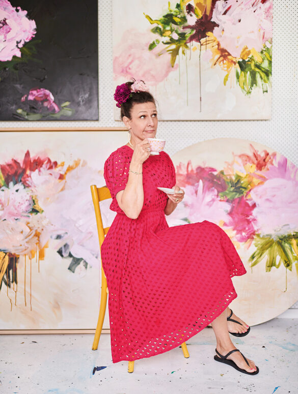 Through this latest body of work, Stichbury explores notions of familiarity, discovery, and perception. The paintings are a sensory reflection of time spent in our collective confinement, and the resulting observation and closer inspection of her local surroundings, calling the beauty and colour that exists there back to the studio and utilising what she sees as an escape from the otherwise grey world beyond. Alongside abstracts in brilliant gold and azure blues, included in Nature Unfolding  are new floral works, shifting Stichbury’s previous small-scale botanical investigations into larger-than-life blooms that reverberate with her gestural areas of texture and exquisite palette.