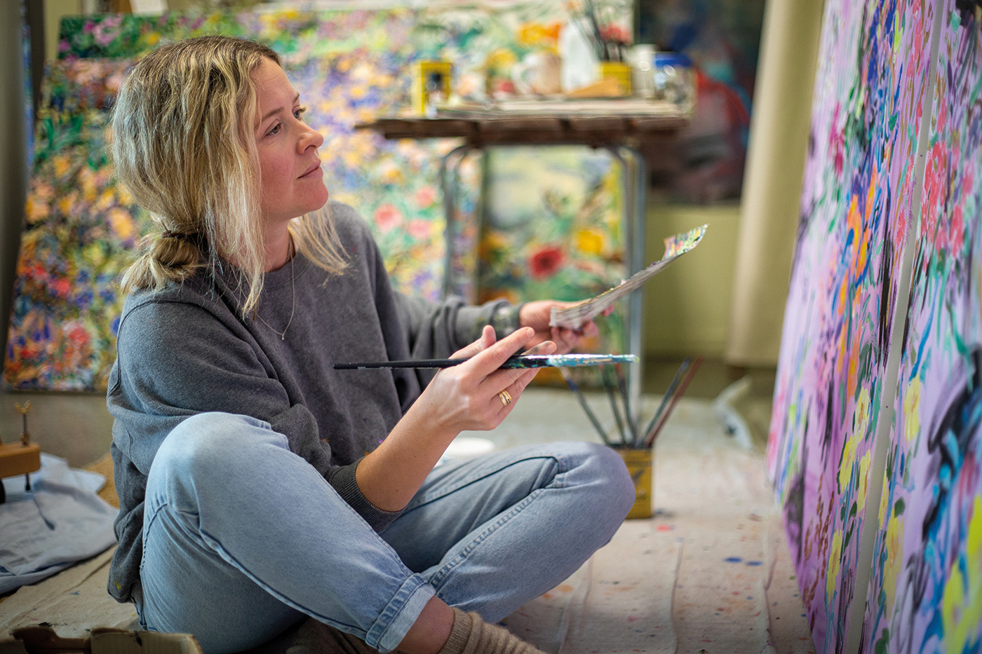 I ask if Carmel revisits her work often, either for inspiration or to self-critique. Or if she believes once it’s done, it’s time to move on. She knows what sells, she says, but any attempts to recreate or copy her own work “looks stagnant” because she’s “trying to represent something that came from a certain place of me”. “That’s why I don’t do commissions anymore. I cannot do it. It will not come out the way I think it will come out. My painting is intuitive.”
