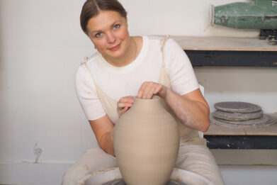 The studio of ceramicist Lucy McMillan sits in a “dear friend’s” garden shed, surrounded by a small orchard in a beautifully kept garden as natural light cascades through sizeable doors.