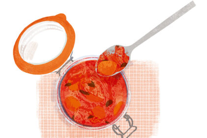 Peach jam is often overly sweet, so to counteract this I like to add soft herbs to balance the sweetness.