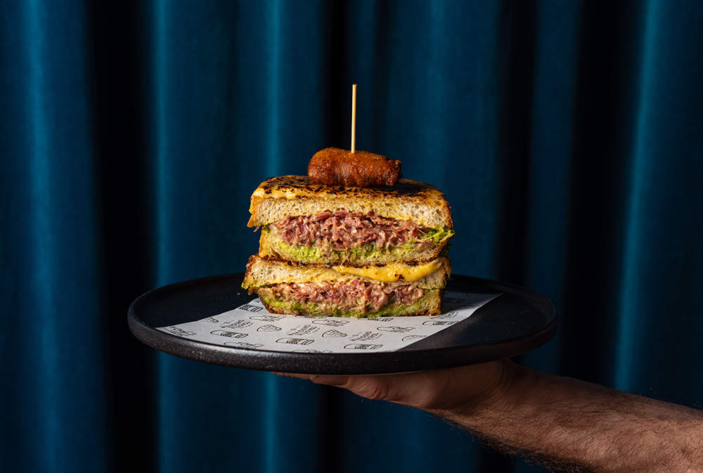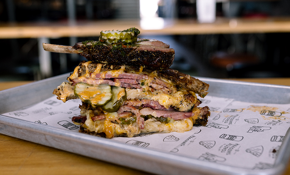 Freeport Cleaver & Co (Tauranga): Surf, Turf & Smoke, Monsieur!:Housemade smoked lamb pastrami, smoked prawns, mozzarella, smoked cheddar sauce and McClure’s Sweet & Spicy Pickles between BreadHead sourdough. Served with smoked aioli and pickle juice gel.