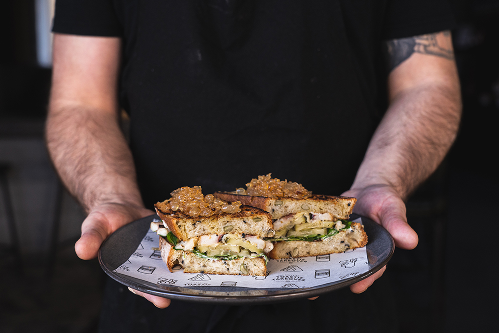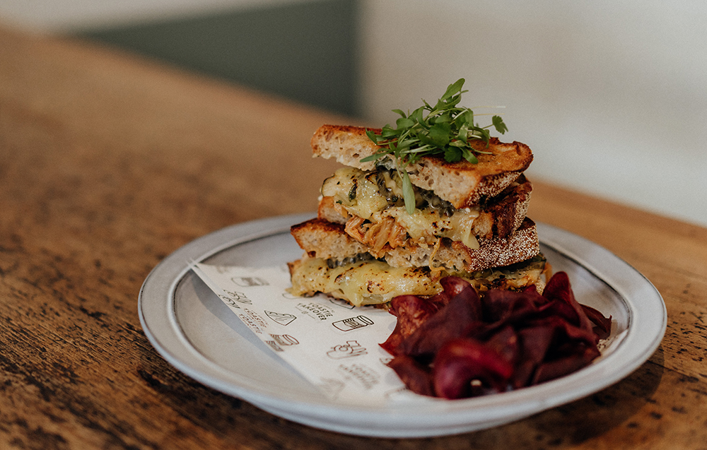 Hayes Common (Hamilton): Grilled Pickle Kim-Cheese (vegetarian): Hayes Kimchi, sesame mayo, McClure’s Sweet & Spicy Pickles, cheddar, crispy shallots and spring onion greens on toasted Volare Pain au Levin. Served with kumara crisps.