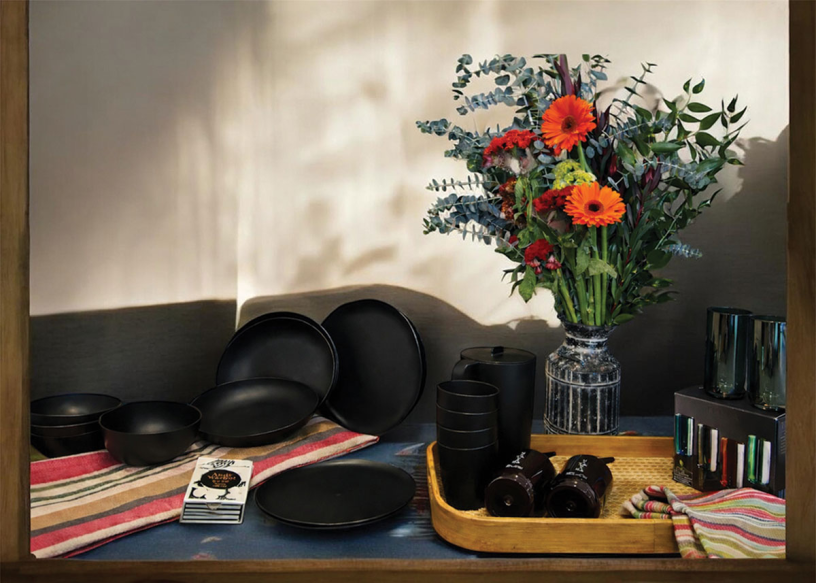 WIN a luxury homeware collection including striking matte black tableware, lotions, a large bamboo serving tray, extra-large retro beach towel with matching pouch, and an Andy Warhol super stylish playing cards, valued at over $500.
